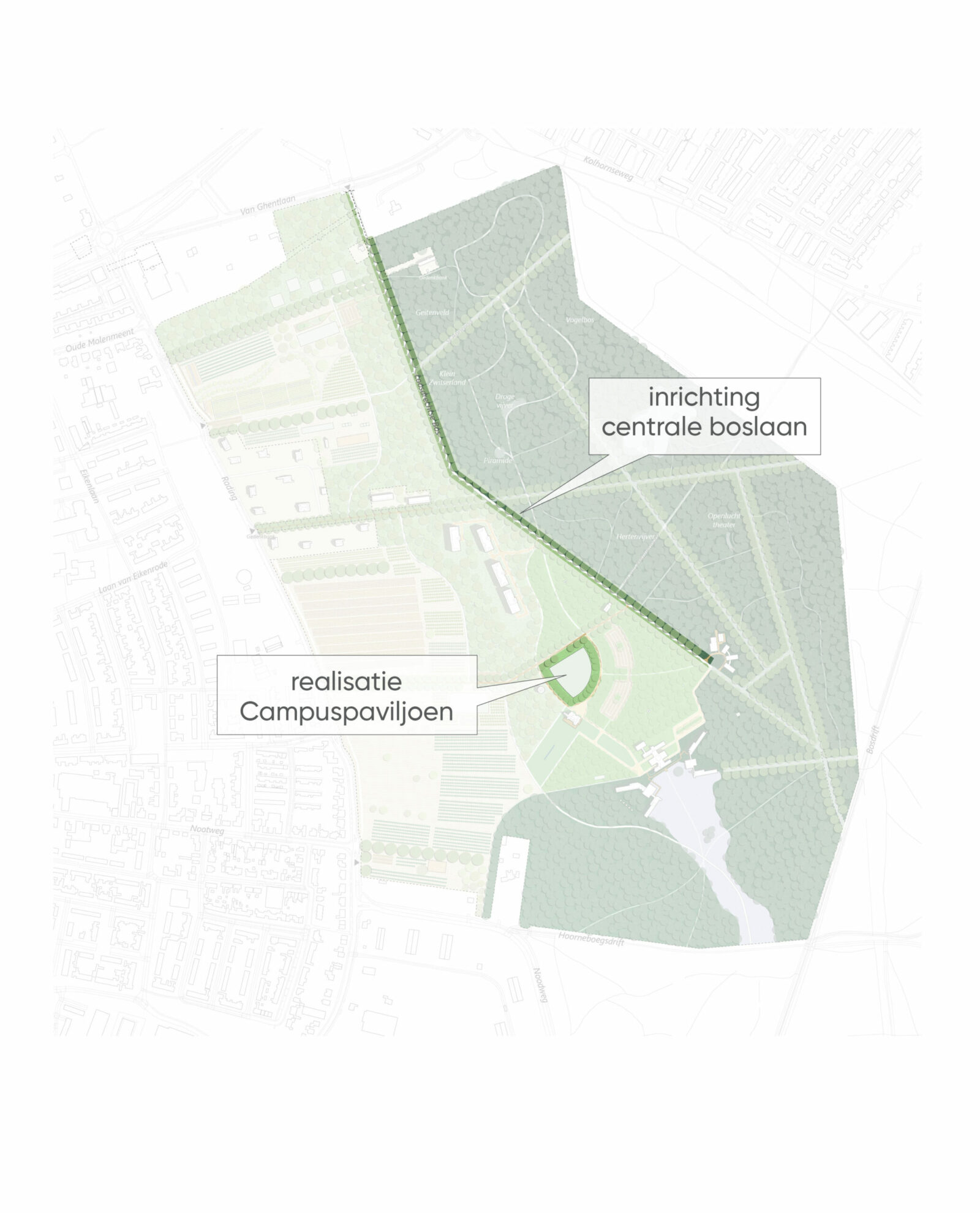 Vanaf 2030 gaan we verder met het realiseren van de Campus, naargelang de behoefte van de gebruikers en wordt de mogelijk de Boslaan versmald.