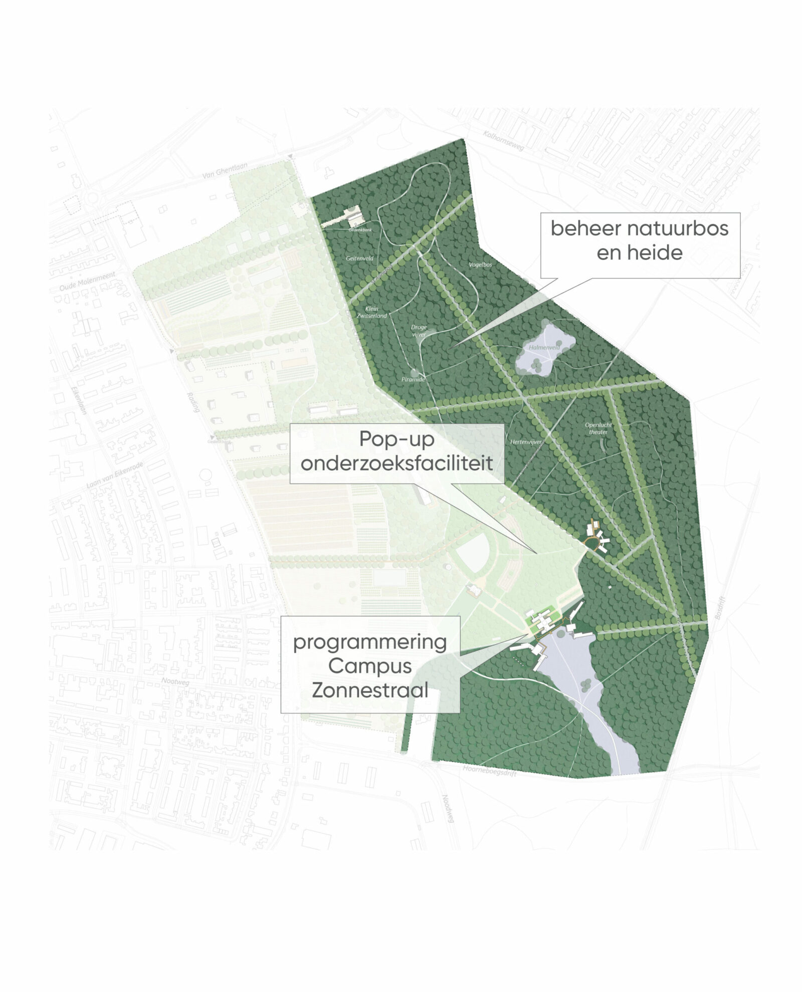 De belangrijkste ontwikkelingen op het natuurlandgoed Zonnestraal vinden plaats in drie verschillende deelgebieden: Campus Zonnestraal, de woon- en werkgemeenschap en het gebied van de regeneratieve boerderij en hangar.